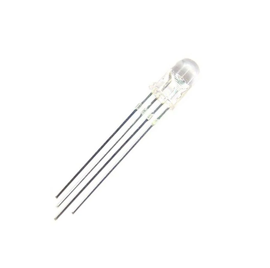 O LED Alto Brilho RGB 5mm Ânodo Comum é um componente eletrônico emissor de luz capaz de gerar as cores vermelho, verde e azul por meio do acionamento individual de seus terminais internos. A combinação dessas cores permite a criação de diversos efeitos luminosos e tonalidades diferentes.